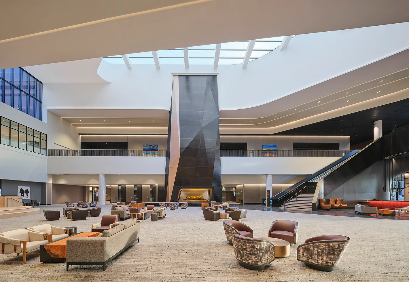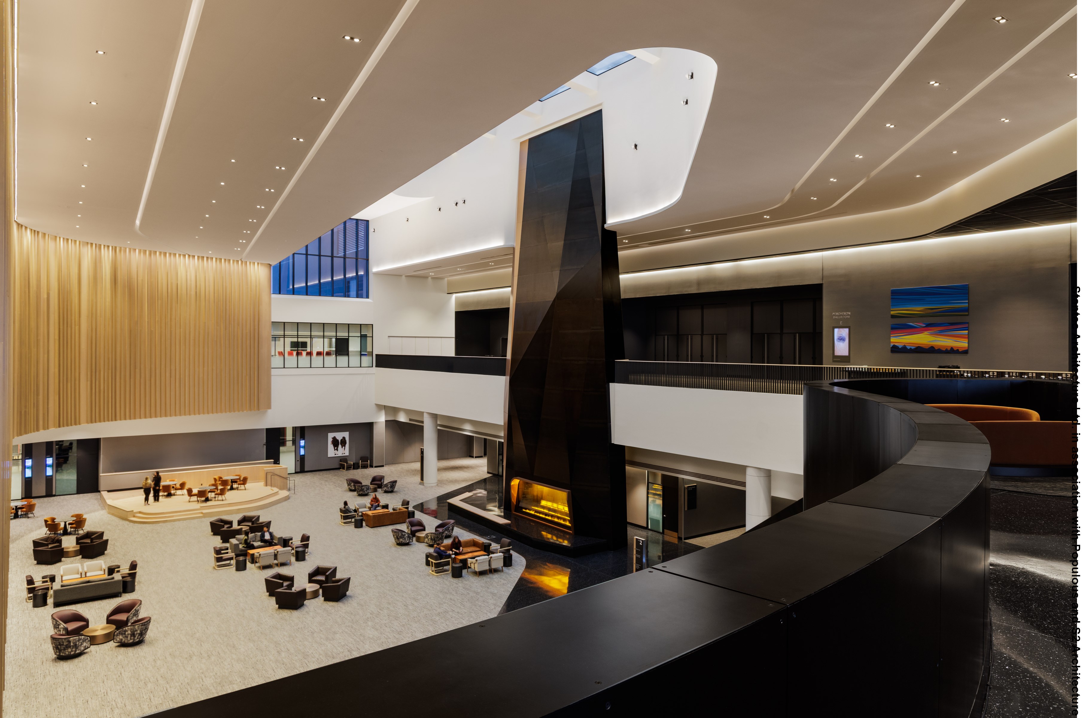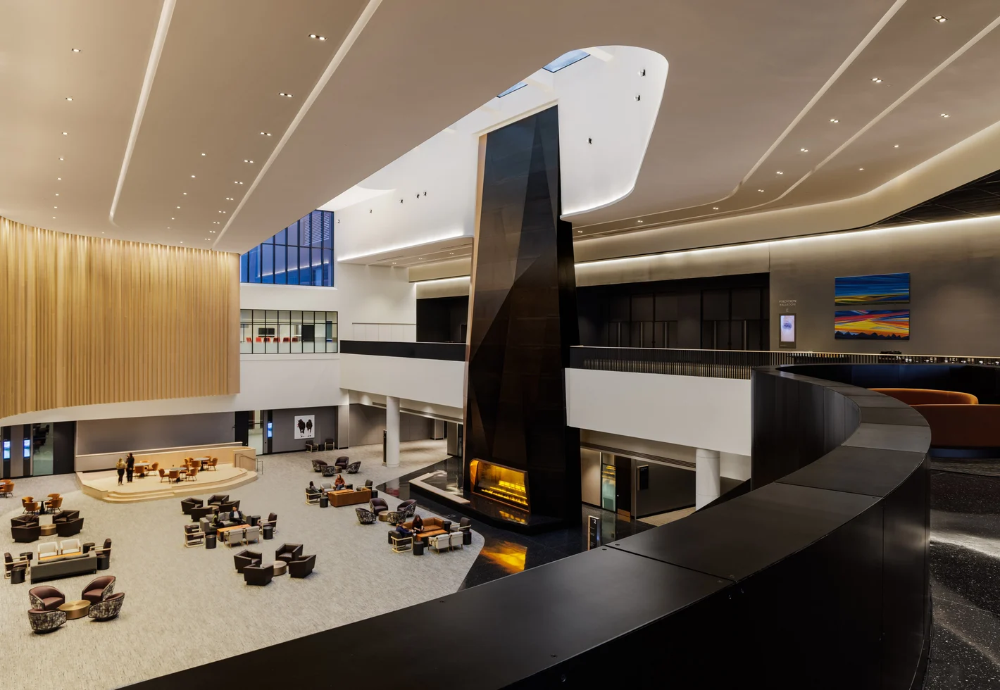 At the heart of the BMO Centre expansion, The Exchange serves as a dramatic central gathering space, anchored by Canada’s largest indoor fireplace standing an impressive 21 meters tall. Clad in blackened steel and copper, the fireplace is a nod to Calgary’s western heritage, evoking the warmth and connection of gathering around a campfire to share ideas.