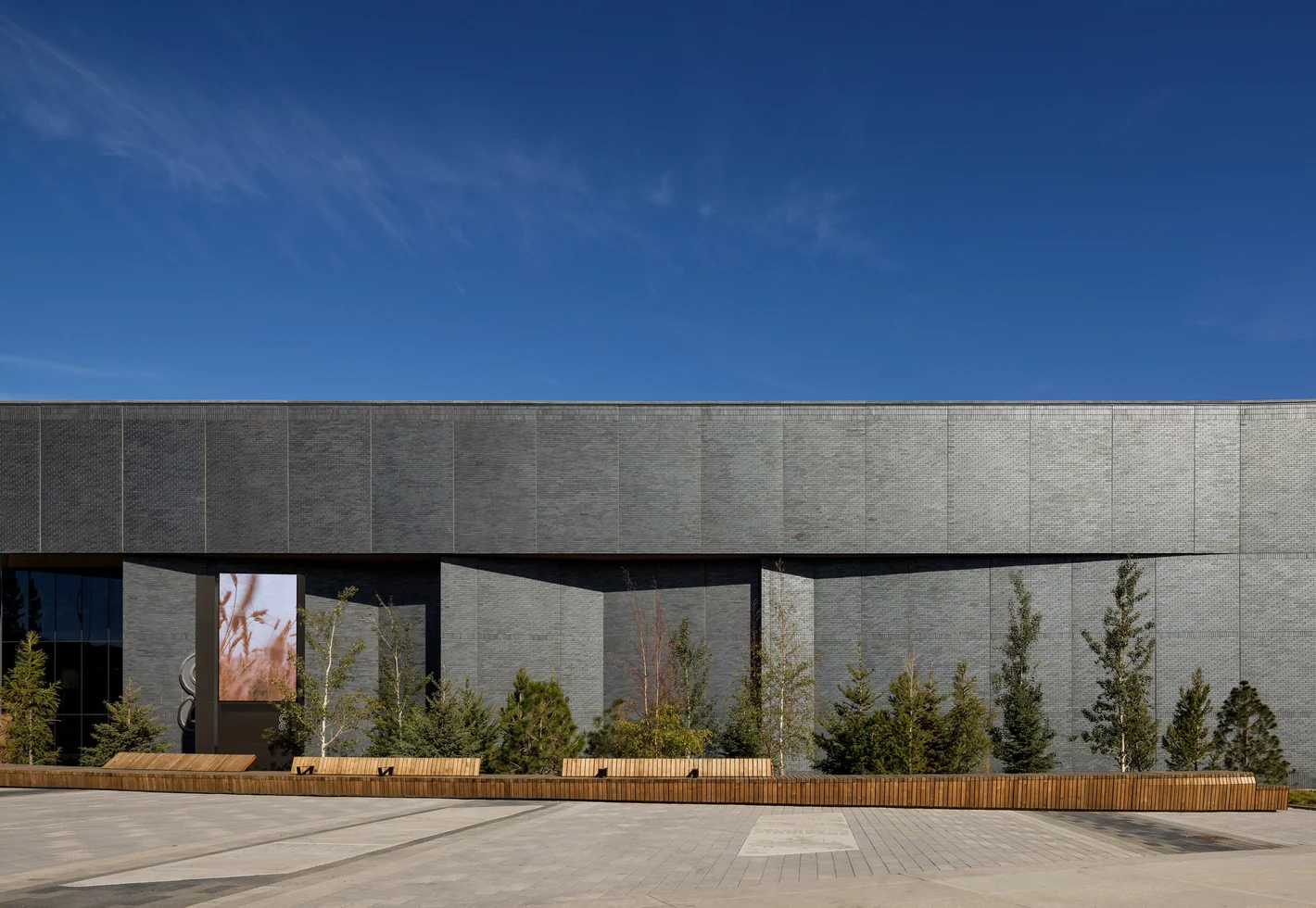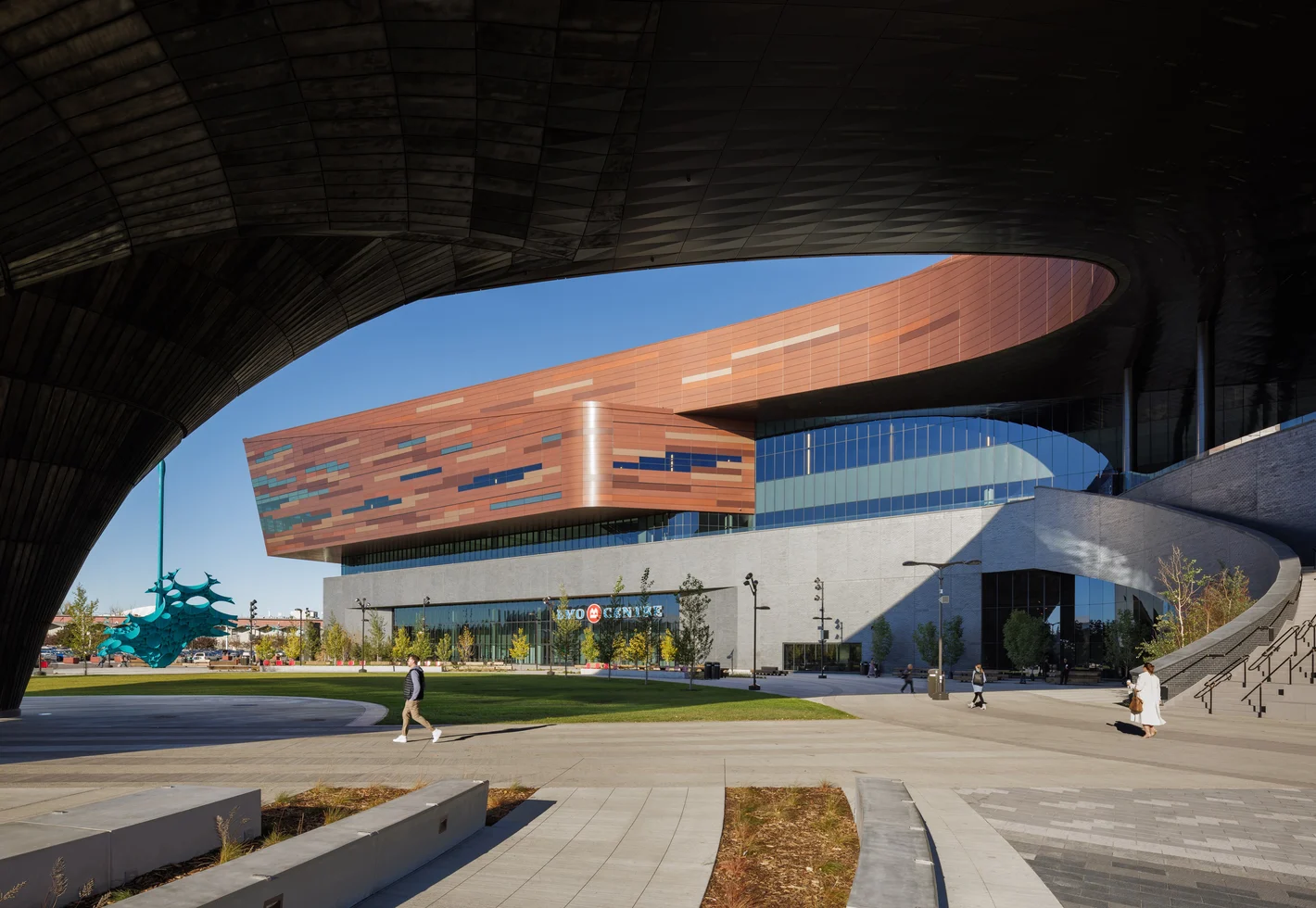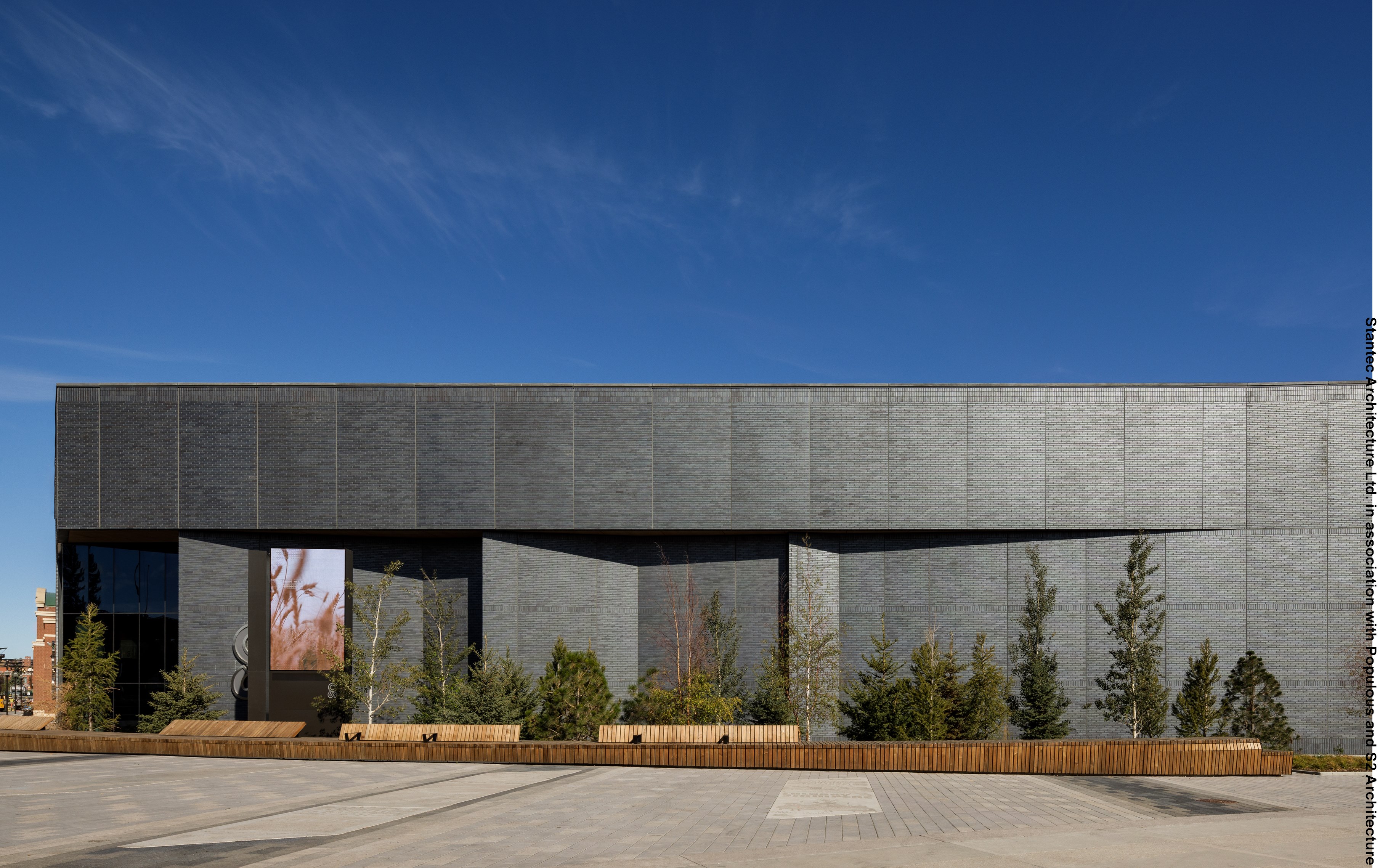 The three-level building showcases a modern design with a sweeping metal panel façade and a 170-foot curved canopy that seamlessly integrates with the outdoor public space while copper-colored cladding, inspired by rustic barn boards, shines like a belt buckle, adding a touch of Calgary’s Western heritage.