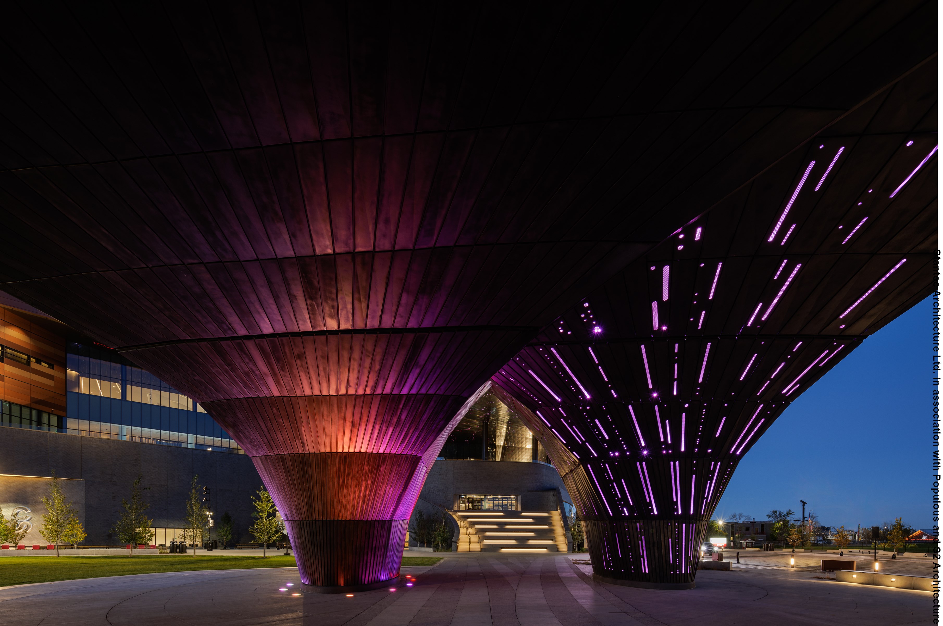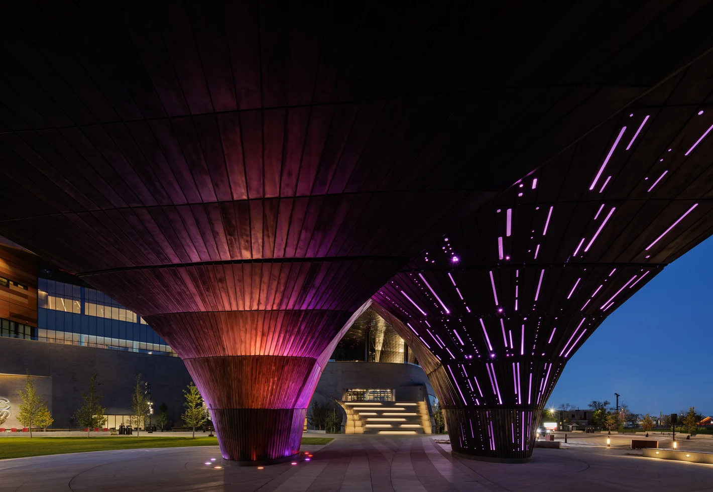 The Pavilion Lights at the BMO Centre feature 1,500 unique lighting soffits that illuminate the building’s striking 170-ft. curved canopy. Extending seamlessly from the expansion to the outdoor plaza on the building’s south side, the lights create an inviting and dynamic atmosphere for event guests.