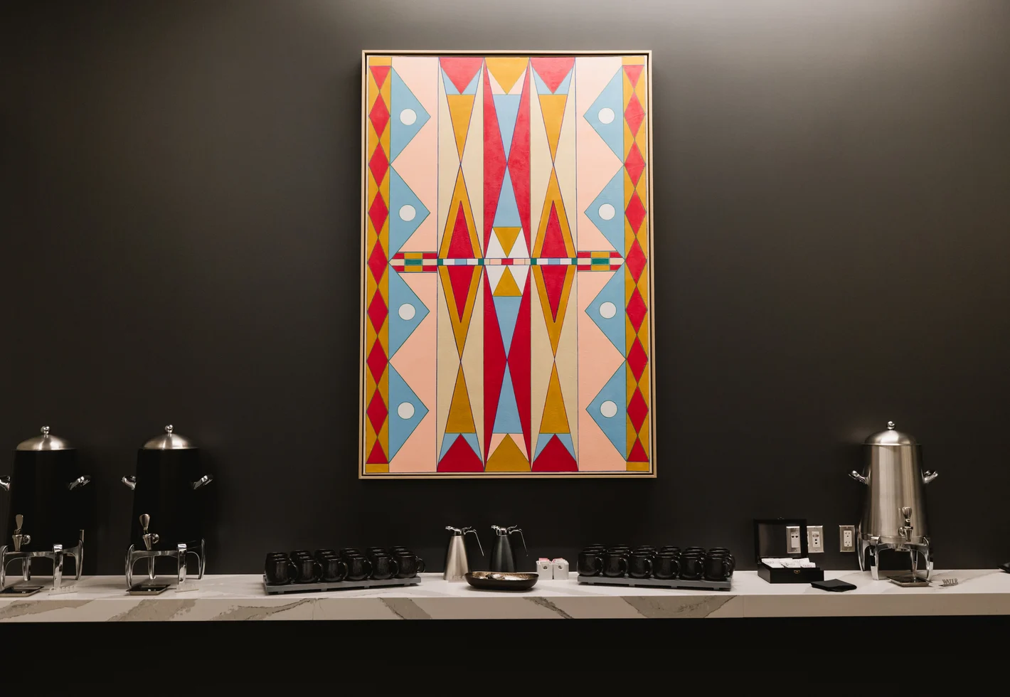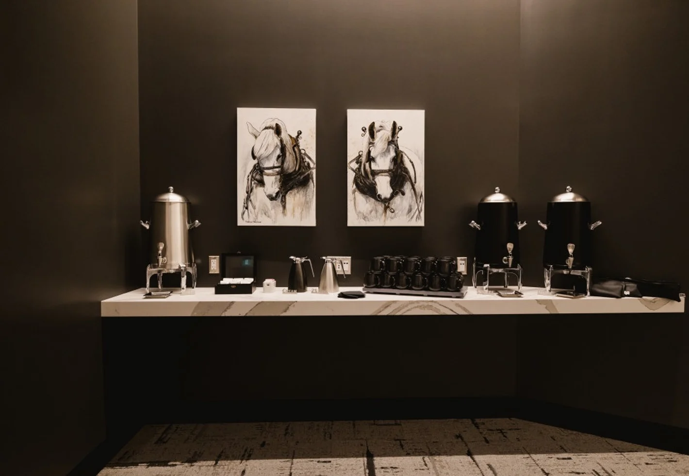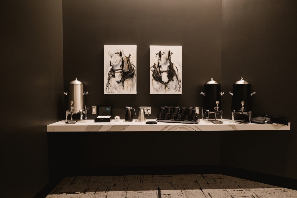To welcome guests, the Brand Room doors feature a custom stitch design by Alberta Boot Company, paying tribute to the Calgary Stampede’s heritage with their iconic “Calgary” stitch pattern. This design marries the Stampede’s Western legacy with contemporary elegance, adding a distinctive touch to this unique meeting space.