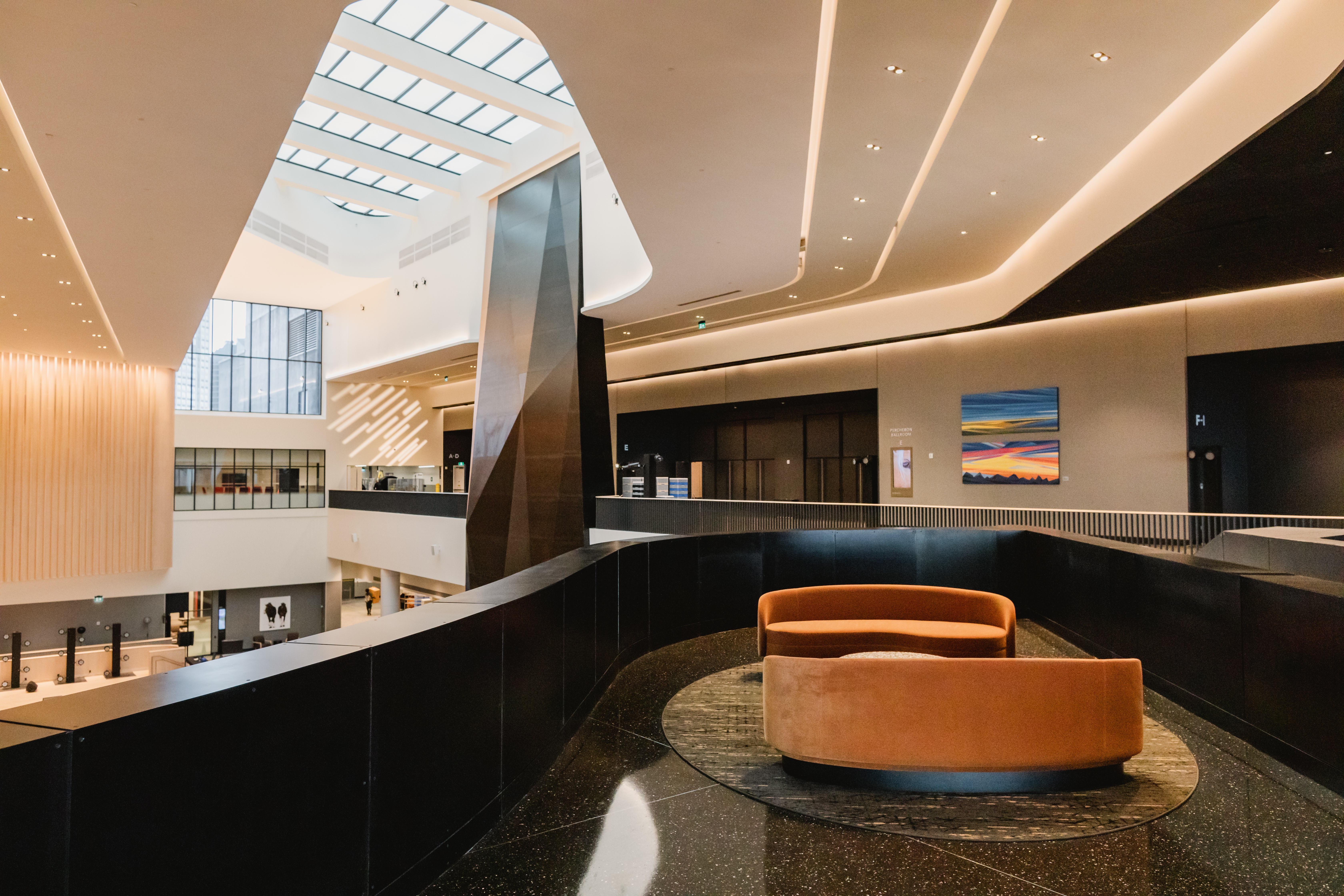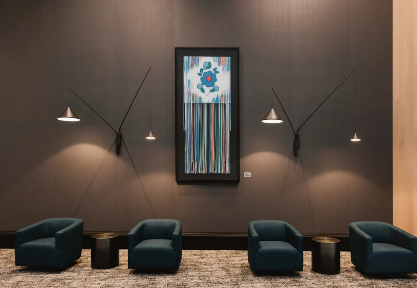To welcome guests, the Brand Room doors feature a custom stitch design by Alberta Boot Company, paying tribute to the Calgary Stampede’s heritage with their iconic “Calgary” stitch pattern. This design marries the Stampede’s Western legacy with contemporary elegance, adding a distinctive touch to this unique meeting space.